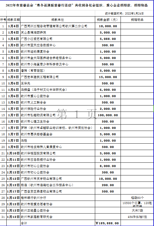 钦州市慈善总会2022年春节“寒冬送温暖慈善行”活动接收社会捐赠情况公示