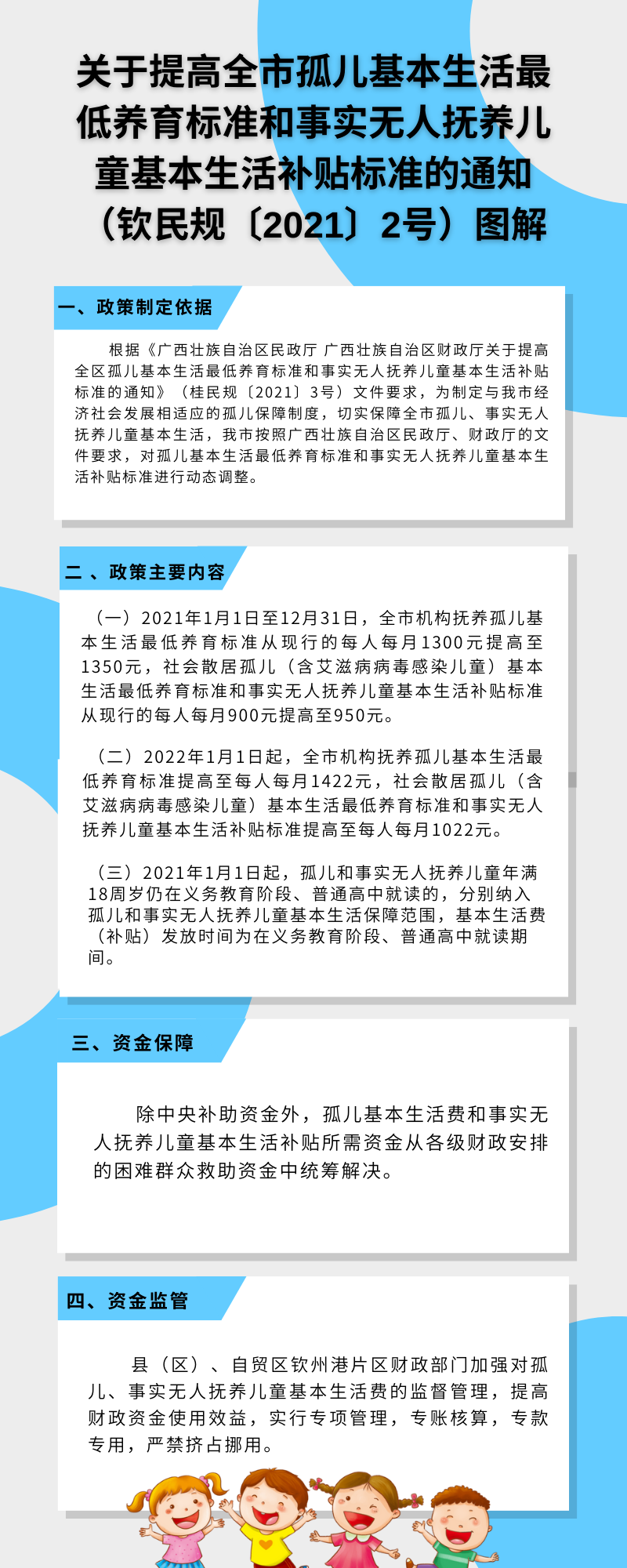 《钦州市民政局 钦州市财政局关于提高全市孤儿基本生活最低养育标准和事实无人抚养儿童基本生活补贴标准的通知》(钦民规〔2021〕2号)图解