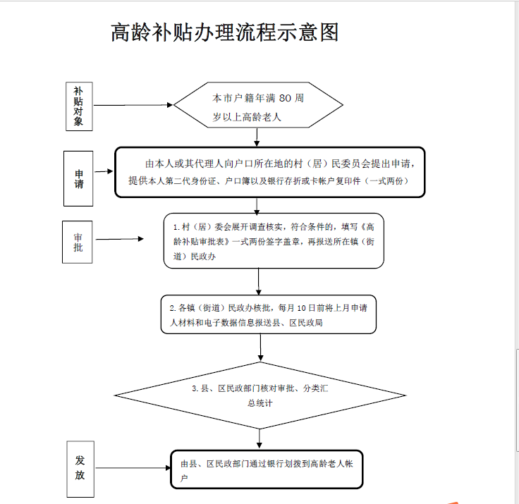 3、发放补助金:高龄老年人生活补贴由县、区民政局采取“一人一折”方式委托银行机构按月代发。